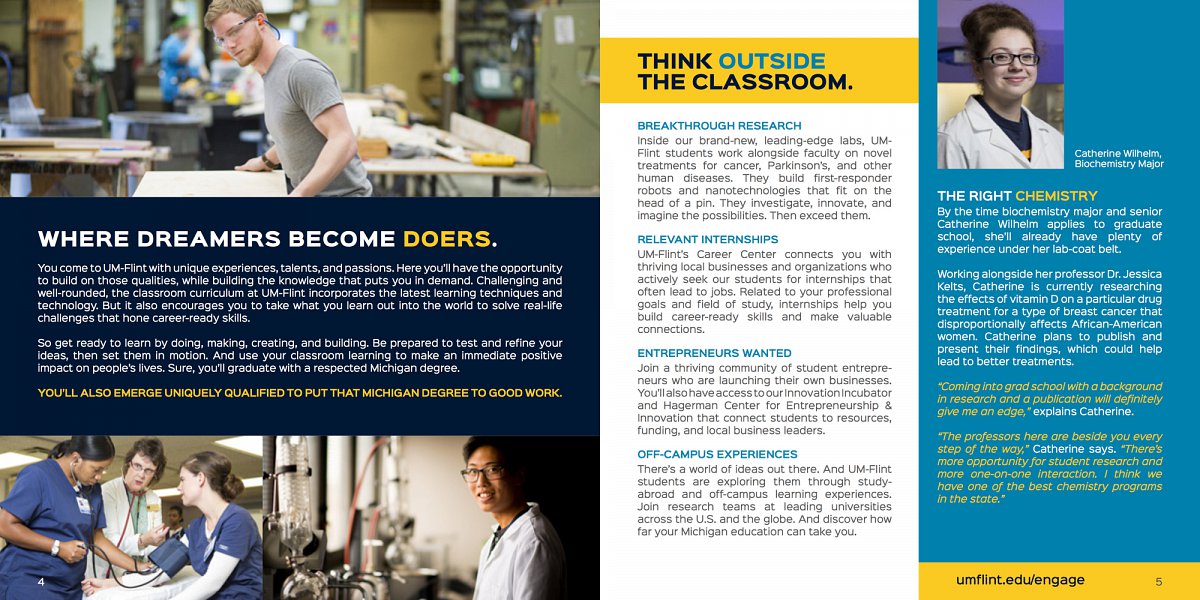 The new brand encapsulates the unique perspective UM-Flint brings to a renowned University of Michigan education, while celebrating the uniquely prepared graduates who emerge from this remarkable, resilient campus ready to use their degree as a force for good. It's working: UM-Flint recently hit its freshman enrollment goals for the first time in five years.