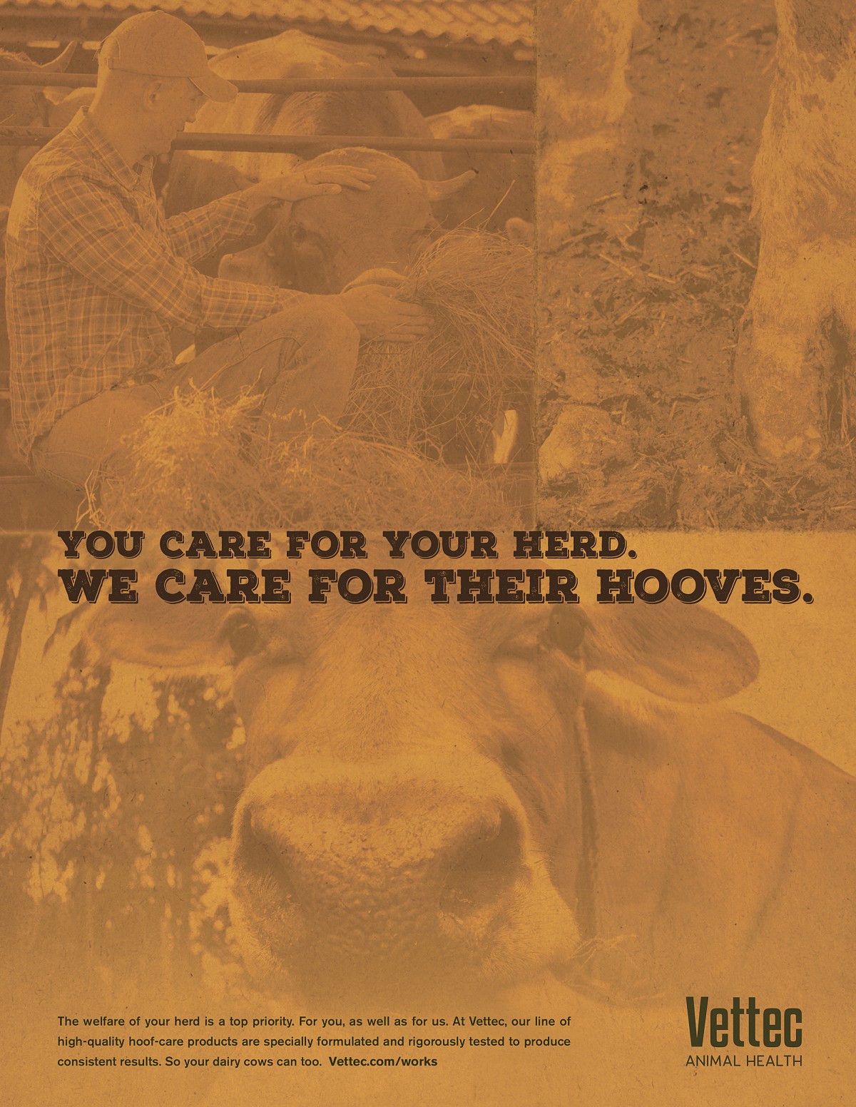 Makers of hoof-health products for horses and cattle, Vettec needed a new brand that instilled trust and communicated authenticity among its audience: large animal vets, blacksmiths, farriers, and ranchers. We created two companion campaigns — one featuring Tab Pigg, Vettec's colorful spokesperson and seasoned farrier with a respected reputation among his peers. The campaign spoke to the audience in their own straight-forward language, and injected humor into one of the toughest professions out there. Designer: Brand Sergeant